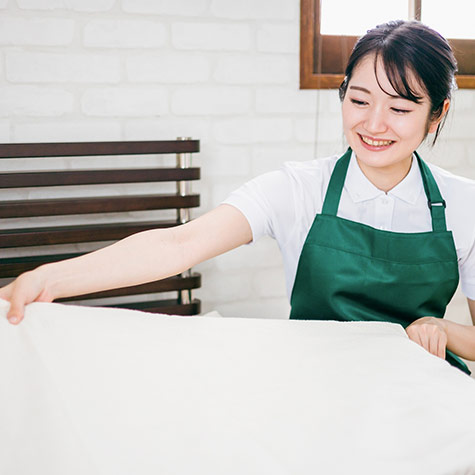 | 仕事内容 | 客室清掃及び館内清掃業務をお任せいたします! 具体的には ◆ベッドメイキング ◆浴室の清掃 ◆アメニティの補充 ペアでのお仕事になるため、未経験でも安心のお仕事内容です |