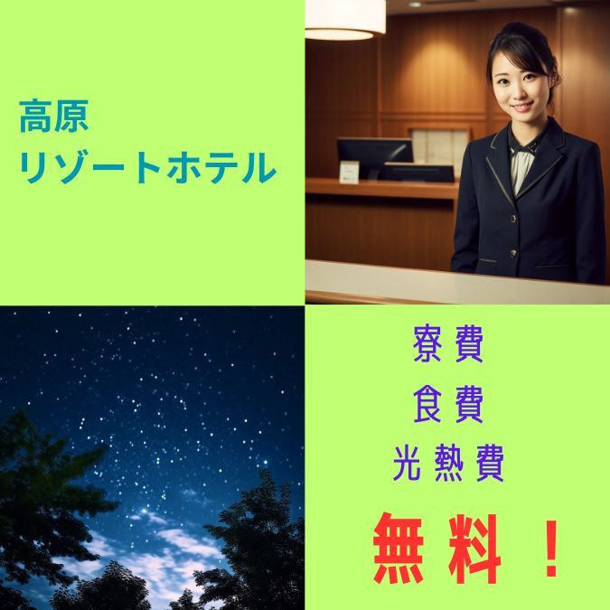 | 特長 | 未経験者可能/交通費支給/制服貸与/女性が活躍/高原・山/食費無料/大量募集/ワーホリ歓迎 |