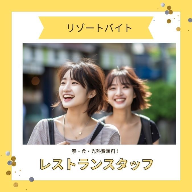 | 応募資格 | 経験者優遇 未経験者歓迎 ワーホリOK 19歳~30代の方が活躍してます♪ 経験は一切不問☆ リゾートバイトが初めての方も多くいらっしゃいます♪ 経験者は記載時給より高めのスタートも可! 詳しくは担当者にお問い合わせ下さい★ 学生さん・フリーターさん大歓迎! |