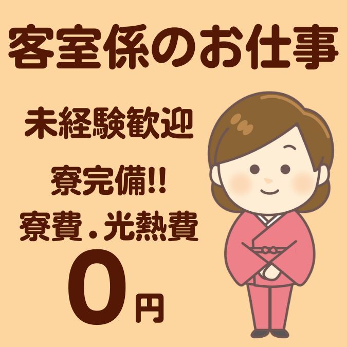 | 仕事内容 | <旅館客室係> ◇食事処での配膳/下膳 ◇お部屋出し ◇ 準備/片づけ ◇ 簡単な洗い物・ 清掃 ◇その他付随業務 |