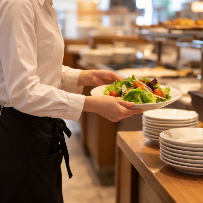 バイキング会場での受付やご案内、料理の補充、ドリンク提供、下膳、会場清掃などを担当していただきます。