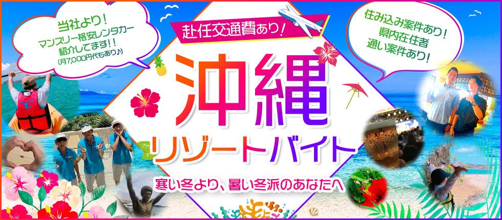 *:..。o○☆沖縄には魅力がたくさん *:..。o○☆ 澄み切った空と、美しい珊瑚礁の海。離島の歴史と亜熱帯の自然。 沖縄には、様々な絶景や大自然、アクティビティがそろっています★ 住み込みはもちろん!通勤も相談OKなので、地元の方も大歓迎~♫ 2019年も、おすすめのお仕事をたくさんご案内♡♡♡ 人気案件は早い者勝ちなので、お早めにご相談下さい!