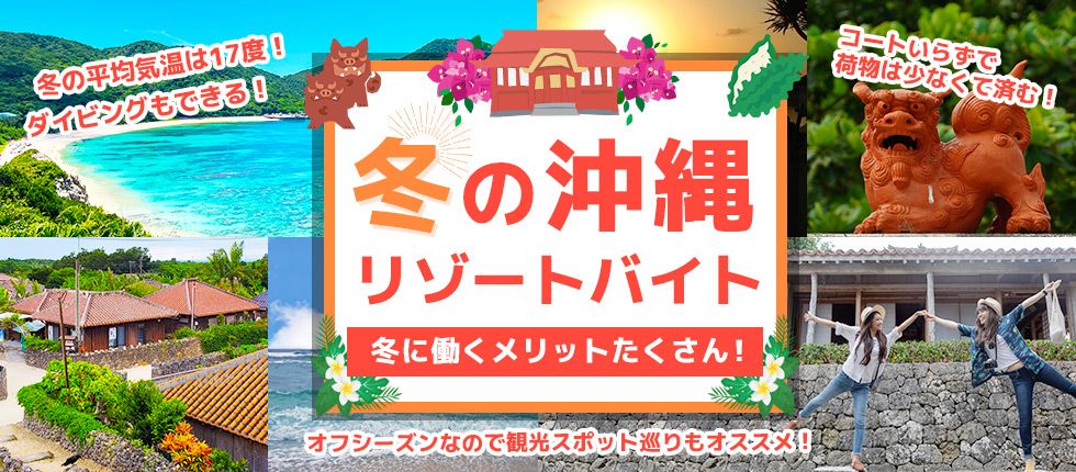 沖縄の冬は平均気温17度前後なので、暖かい冬を過ごせます!ダウンジャケットやコートはいらないので、荷物も軽量で済みます♪ 沖縄の冬は海は透明度が高く、1年でもっともキレイな海と呼ばれるほど美しいエメラルドグリーンな海を楽しめます!ウェットスーツを着てダイビングもできますよ!